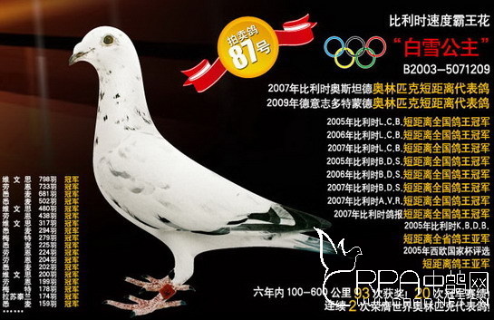 “白雪公主”B2003-5071209白花黄眼雌,比赛距离从100公里至600公里93次获奖,20次获比赛冠军记录;并获7次鸽王冠军;2次鸽王亚军的娇人;2次入赏世界奥林匹克代表鸽的殊荣,成为当今世界上最优秀、最耐翔的白羽赛鸽。
