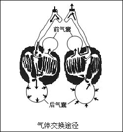 对鸟类的“双重呼吸”,动物学教科书大都这样解释:鸟类无论吸气还是呼气,肺前后两次进行气体交换,这种现象称为双重呼吸。这种解释的内涵似乎是只有鸟类才在吸气和呼气时前后两次进行气体交换,而其他陆生脊椎动物(以下简称肺泡呼吸动物)只在吸气时进行气体交换,呼气时并不进行气体交换。显然,这样解释鸟类“双重呼吸”,不科学。众所周知,鸟肺的毛细支气管和肺泡呼吸动物的肺泡,是进行气体交换的具体场所,而这两种场所与其周围的毛细血管血液进行气体交换,均是通过物理扩散的方式来完成的。气体扩散的方向和数量取决于“膜”两侧的气体分压差。这里所说的“膜”是指肺毛细支气管或肺泡与其周围的血管壁。外呼吸和内呼吸导致肺毛细支气或肺泡中的气体总是O2多CO2少,而血液中总是CO2多O2少,这样肺毛细支气管或肺泡的O2分压总是高于血液中的O2分压;而血液中的CO2分压总是高于肺毛细支气管或肺泡的CO2分压。根据气体扩散原理,气体总是从分压高的一面向分压低的一面扩散,直至达到动态平衡。但由于外呼吸和内呼吸的持续进行,这种动态平衡实际上永远也达不到。既然肺毛细支气管或肺泡与血液之间永远存在着气体分压差,气体交换就会永无休止地持续进行,决不会出现吸气时进行气体交换而呼气时不进行气体交换的局面。因此,任何肺泡呼吸动物都同鸟类一样,无论吸气和呼气都在进行气体交换。 那么,鸟类与肺泡呼吸动物的呼吸差别究竟在哪里呢?这得从两者的不同肺结构及其特点说起。 鸟肺的基本结构是由初级支气管、次级支气管、三级支气管和从三级支气管辐射出来的毛细支气管互相吻合而成的网状管道系统,没有盲端是其特点之一。毛细支气管即是鸟肺的呼吸功能单位。鸟肺另一特点是其气囊系统(见图), 图中的颈气囊、锁间气囊和前胸气囊属于呼气囊,与次级支气管相通连;而后胸气囊和腹气囊属于吸气囊,与初级支气管相通连。吸气时,另一部分新鲜空气直接进入肺毛细支气管与毛细血管的血液进行气体交换,而原毛细支气管经过气体交换的陈气经次级支气管进入呼气囊。另一部分新鲜空气则直接进入与初级支气管相通连的吸气囊。呼气时,吸气囊的新鲜空气因压力关系并不原路返回,而是通过返回支进入毛细支气管进行第二次气体交换。与此同时,呼气囊的陈气被排出体外(见图)。 如此单向流动周而复始,反复进行。从中可以看出,一个新鲜气团从吸入到排出,需经过两个呼吸周期,而且不论吸气和呼气,进入肺毛细支气管的气体都是新鲜空气。 肺泡呼吸动物的肺都是由气管反复分支后最终形成具有盲端的肺泡结构。哺乳类的肺最为复杂,被称为支气管树。肺泡即是呼吸的功能单位。在呼气结束时,肺内的气体不能完全排空,仍积存着一定数量的余气,同时肺内各级支气管和气管内也存留着来自肺泡经过气体交换的陈气。在下次吸气时,这些陈气又必然重新先回到肺泡,尔后才是新鲜空气的跟踪而入。所以在吸气结束时,肺泡内的气体是由余气,陈气和新鲜空气组成的混合气体。在下次呼气时,存在于气管和各级支气管的新鲜空气必然首先呼出,然后才是经过气体交换的陈气跟踪呼出体外。由此可以看出,肺泡呼吸动物从外界吸入新鲜空气到排出体外,呼吸气流的走向是来回道,即气流在肺内是双向流动,而且只经过一个呼吸周期。肺泡内的气体成分是混合性气体。 综上所述,鸟类与肺泡呼吸动物的呼吸差别是:前者吸入的新鲜空气需经两个呼吸周期才能排出体外,而后者仅需一个呼吸周期;前者的呼吸气流在肺内是单向流动,而后者是双向流动;前者在吸气和呼气时都有新鲜气体入肺,O2分压较高, CO2分压较低,而后者只在吸气时才有新鲜气体入肺,且与余气、陈气混合形成混合气体,O2分压较低,CO2分压较高。 经上述分析思考,对鸟类的“双重呼吸”作如下解释较为合理:鸟类无论吸气和呼气都有新鲜气体进入肺呼吸单位进行气体交换,而且吸入的新鲜空气需经两个呼吸周期才排出体外,所以鸟肺呼吸效能高。 由于图片只能发一张你结合天津的球手发的那一张就对了. 2006-6-29 6:19:16