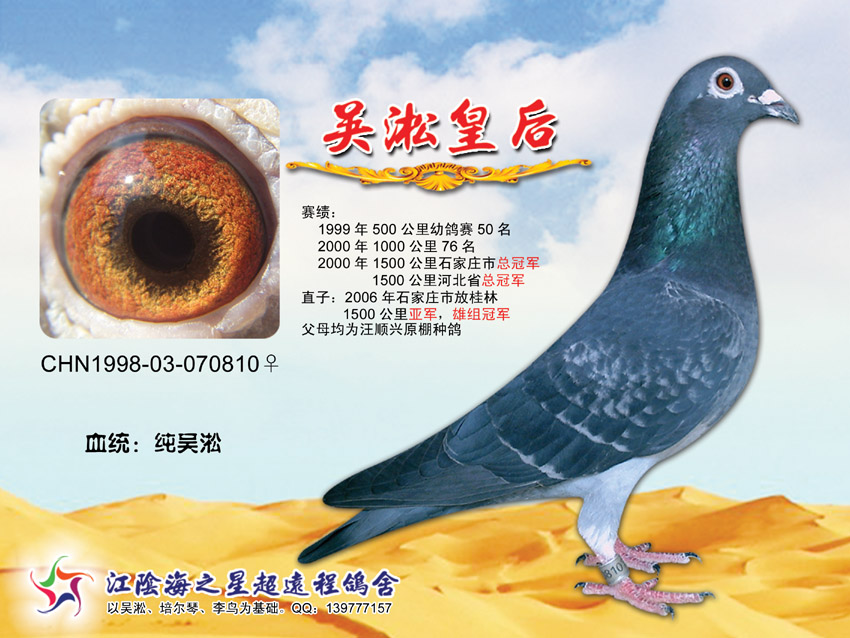 这个全圈型黄眼志做种很好,选择种鸽一定要多关注血统与赛绩,眼砂只是表面的东西,只能作为参考。