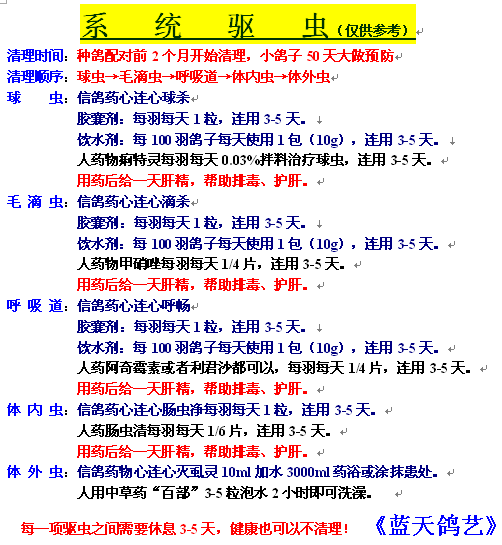 本鸽舍己参赛公棚七年.送公棚幼鸽不需要用药驱体内虫.但最好在幼鸽35天大用鸽药毛滴虫、球虫二合一用药三天进行预防为好!