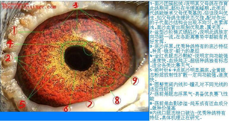 眼砂在生理解剖上称作虹膜,赛鸽的眼砂色彩要鲜明,纹粒要清晰,用放大镜看,有一种立体感。