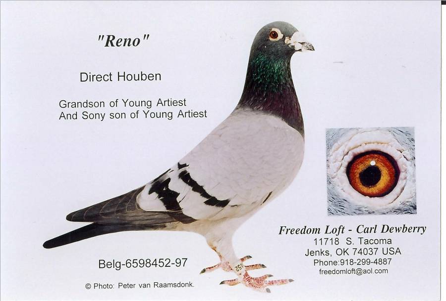 1、罗宾号(B90-6277397):本身获91年《比利时信鸽报》一岁鸽全国鸽王冠军、91年比利时国家中距离鸽王7位、93年拉斯帕马斯奥林匹克中距离季军等等!代表子代“皮诺曹”(B98-6210287)获亚精顿联省赛9864羽冠军、亚精顿联省赛4740羽冠军等!“皮诺曹”作出“金翼”(B99-6143594雄,获拉苏特年4573羽冠军、4250羽亚军)、“单生汉”(B01-6255263雄,波治省赛1463羽亚军、国家赛12389羽10名)、“丹迪”(B99-6143595雄,维尔松亚军)等