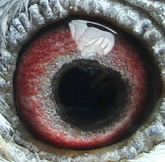 点击打开 鸽眼瞳孔外圈略向前下角荡移的凸出部分,眼志学说论者鉴别鸽子优劣的依据之一。中国许多养鸽老手对国外“瞳孔圆整、瞳仁要黑”论持相反意见,他们要求鸽眼有荡角,即便椭圆形者也不碍事。他们认为,优良信鸽的瞳孔呈圆形,但在飞行中寻找地面目标或地面觅食时,视线方向约在7时至7时半的方位,促使前下角的活动量大于后上角,久而久之形成外圈荡向前下角,呈不规则的卵圆形。远程比赛归来的赛鸽,瞳孔常呈卵圆形或外圈荡向前下角。故信鸽瞳孔出现荡角,说明此鸽参赛经验丰富,归巢欲强。