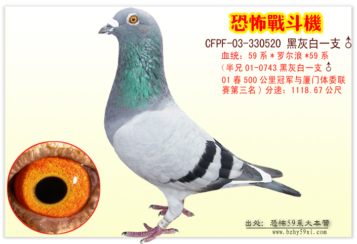 “恐怖59系”之始创人鲍氏兄弟之一,鲍卓英。他今年48岁,台湾高雄人。少年时的鲍氏兄弟就痴迷上了养鸽,但父母顾虑他们耽误学业所以坚持反对,不予经济上的支持。则他们就把父母给的零用钱积攒起来玩上了赛鸽。由于兄弟二人悟性过人,不断地钻研鸽经,磨砺鸽艺,不久就在高雄鸽届脱颖而出,小小年纪连获七届冠军,令高雄鸽届大为震惊,鸽友也把他们驯养的信鸽命名为“恐怖59系列”。 自此也开始了鲍氏兄弟鸽届之宏图。 99年正当他们事业如日中天之时,鲍卓英只身一人来到了厦门,开始了他更具挑战性的赛鸽人生。在祖国大陆这片广阔的空间,不受地域限制,可以进行200—700公里范围的重点赛事。经过数年的养鸽实践,鲍卓英鸽道精深,既有章可循,又自成一路,单脉相承三十余年,在赛鸽中也屡有斩获,赛绩骄人,更造泽四方鸽友。但他也有遗憾,他希望有一天,他的赛鸽能够在海峡两岸互飞中再获殊荣! 恐怖59系三十年来多层次近亲之特征简介 恐怖59,性格温顺,早熟,胆大灵巧,具备吃苦耐劳归巢快的特性,所以经常在比赛中能勇夺冠军优胜或伯马,尤其是恶劣气候的赛事中成绩更凸显优势,让主人钟爱一生。 恐怖59幼仔七日后全身肉体转成黑紫色泽,出巢后全身将显现不定点的白。梅点,如颈部,眼睑及主副羽或翅膀内外缘和背部等。繁殖时,时常有双雄双雌出现,会黄眼X黄眼出砂眼或红色瞳孔。羽色以暗灰居多;灰X灰会出现银或粟色或50%以上白色羽毛或石板等。 恐怖59赛鸽与主人亲和性好,前额凸宽,后脑峻,前胸宽厚,气哴浑大,肌肉饱满富有弹性。背部及后腰自然厚实成箭尾,羽毛大都有鱼鳞叠片状为佳。嘴啄粗短,爪短微弯,嘴亦粗短,内缘有呈黑芝点相互参差为优,尤其脸部颈部有微或明显的直横斜纹更成上品,血统更纯厚。59系赛鸽不少为无眼志,但却有深瞳孔,显现敏锐有神之感,后代更威武耐翔。雄鸽的鼻子是以桃形为纯,而雌鸽鼻子小则更有耐翔快速度。与其他鸽系杂交融合性高,速度及爆发力更强,更具优势。但羽色,个性依旧,才是纯正超强遗传之恐怖59系。 恐怖59系在河南、湖南、新疆、四川、福建、云南等全国各地屡见佳绩。 59号的来龙去脉 70年代高雄市鼓山我的蔡子江先生,本身经营高雄港进出口邮货轮的修护公司也因工作之便常与国内外船务人员接触,话说有一天一艘巴拿马籍的货货进港,船员与蔡子江聊天中得知,蔡先生本身是喜爱养鸽之人,便将饲养在船上已经一段时日的一只配戴日本脚环班色公鸽赠予蔡先生,据船员告知此鸽是在海上行驶中飞落甲板上的,并不了解血源及来历,基于爱鸽心态,基于爱鸽心态蔡子江便欣然接受,并且带回家饲养,这只公鸽即为日后铭鸽59号之父亲。 当时蔡子江先生工作之余的娱乐就是参加赛鸽,并且同时参与两个鸽会的比赛,分别为高雄市直属支会及寿山支会,在当时的比赛中蔡子江先生的成绩亦相当不错,话说寿山支会有一季比赛由蔡先生囊括了大小奖项,得了全会最高奖金,却因该会王会长个人问题,无法将奖金悉数发给蔡先生,只好以一只66-14981灰母及一台鸽钟用来抵偿部分奖金,而抵奖金的66-14981这只灰母的作出者为台南陈正雄先生,血统为善化郑金城先生鼎鼎大名的镇舍之宝:光明希望×荣光姑娘的直子配罗索尔×细川800149的下代鸽,也就说66-14981这只灰母就是光明希望×荣光姑娘这个配对的孙女,66-14981本身于1966年台南市比赛全省豪大雨中所有鸽会全灭结束下失格后唯一当日归返,而66-14981这只灰母也就是日后作出铭鸽59号之母亲。 59号的诞生 然而在蔡子江无意识公凭直觉下的的将这羽日本环公鸽配上66-14981这只灰母,因而作出73-345458斑公、73-34559暗灰母之后,不久在其表弟鲍卓宣的恳求下将66-14981这只灰母割爱于鲍卓宣,但也在易主鲍卓宣没多久66-14981灰母(59号之母)就因病而终,所以59号就再也没有任何同母异父的弟妹鸽了,事后鲍卓宣复又前往要求割爱73-345459这只暗灰母鸽(59号本身),起初蔡子江并不答应,在经过鲍卓宣多次的死缠烂打交涉下,蔡子江虽然勉为其难总算也点头答应割让。 恐怖之由 但由后由于73-345459这羽母鸽在比赛方面的表现实在太突出,使得蔡子江顾不得表弟的承诺,连续将这羽59号母鸽不断的送出参赛,从1974年59号获得寿山支会综合亚军后再转往内惟支会、胜利支会、第一支会……等鸽会继续不间断的参赛,光是单关友谊赛就获七次冠军,其中4次领先亚军14分之上,获得亚军以后名次不计其数,“恐怖”之名就在当时几个鸽会中不胫而走,当鲍卓宣正式接收59号这羽母鸽时,已经是连续得奖参赛半年之后的事了。 作育良才 鲍卓宣先生经一番折腾后好不容易才将59号弄到手,慎重的配上舍内的小王子叼(日本尾内一郎豹王子直孙、罗尔浪×凡布利安娜)作出了75-344404及75-344405同孵双灰公,参加1976年苓雅鸽会元旦季的比赛,却因鲍卓宣、鲍卓英兄弟相继入伍服役无法照料选手鸽,仅能由其母亲代劳喂饲及放飞,比赛期间才由蔡子江胞弟蔡文良先生交鸽及打鸽钟,如此困难情况下这两羽同孵兄弟鸽竟然奇迹般的拿下综合冠军、亚军(单关赛,关关冠军、亚军),跌破了一地的眼镜,鲍卓宣先生在得知消息后,心中却没有一点点的喜悦,因为59号及小王子号于入伍前已将他们分别卖掉了。 59号易主后,其新主人许星亮先生也随后作出一羽1976年别名憨牛的灰色公鸽(因个性温驯,体型壮硕),于民族支会参赛