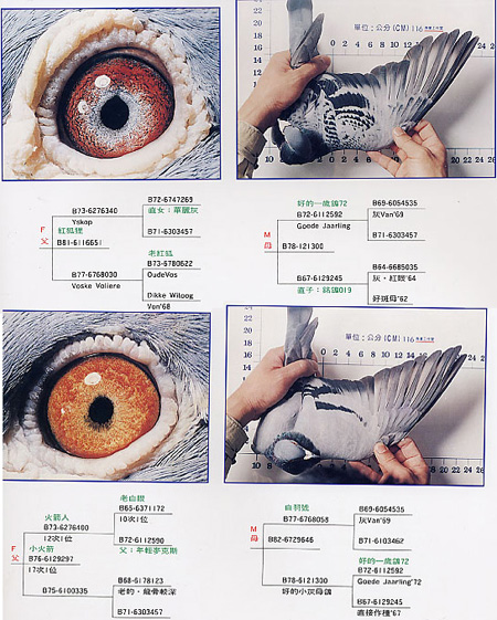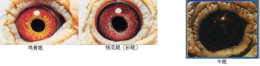 鸽眼的认识:(上图就是詹森八大鸽系中的血统鸽,上图是砂眼,下图是黄眼)对于信鸽眼睛的功能,人们持有各种不同的见解。有人认为,鸽眼是鉴定一羽信鸽是否可以留种或比赛的标志,称之为“冠军鸽的秘密”。也有人认为,在欧洲兴起的“鸽眼论”,到了50年代已处于低谷。更多的人是将信将疑,所谓“不可不信,不可全信”……但是,大多数信鸽爱好者在捉鸽鉴赏时,总喜欢看看这双神秘的眼睛。因此,对鸽眼的正确理解,是基础知识的一个重要方面。 对鸽眼生理结构的名称和用语,信鸽饲养者和眼科医生是不一样的。真有点象中医中药与西医西药那样,神奇的功效却找不到理论依据,科学的理论又解释不了神奇的功效。例如,我经常看到一些养鸽新手们的来信说,养鸽老师傅们常说“鸽眼要干老”,可是我就不知道什么样的眼睛才算又干又老,为什么眼睛干老是优良鸽子。当然,这是一种经验之谈,既不容易掌握,也很难说得清楚。需要多看,细看,有比较地看,熟能生巧,功到自然成。 当你要鉴赏鸽眼时,先不要用放大镜,可按如下的顺序: 在鸽子尚未捉到手里之前,先看它的眼神。当你看到它的同时,它也发现你在注意它,所以它的眼睛会告诉你,这羽鸽子或胆怯,或机警,或善良,或凶猛,或滞呆,或聪明等等。那末,这几种鸽子哪一种好呢?这就是公爱馄饨婆要面,各有各的爱好,各有各的需要。欧洲国家多放中,短程,要求赛一归巢马上钻进活络门,任你捉拿、打钟,报到,争取到时间。他们喜欢秉性善良的,听从使唤的。我国和美国、澳国,都举行超远程竞赛,要求赛鸽在野外觅食、宿夜、能逃避天敌袭击和人的捕捉,就喜欢机警、凶猛的信鸽,捉到手里“咕咕”叫的。但滞呆的鸽子是都不受欢迎的。泰国赛鸽会会长陈木坤在上海鉴赏鸽子时,我见他在离鸽子一公尺远,用手指在鸽子面前来回划几下,观察鸽子的反映。当然,他喜欢敏感的鸽子,如果鸽子眼睛不是跟着转,而是呆若木鸡,这就不见得是好鸽子。 当你一鸽在握之时,先要注意这羽鸽子的眼睛着生的位置,一般的要求生得高一些。但眼睛着生位置的高或低,差别是很微小的,初养鸽子的是很不容易区别的。李梅龄要求鸽眼着生的位置在嘴喙线以上。在养鸽实践中这种鸽子是极少的,而多数是,嘴喙线与眼睛的中心线平行的。鸽眼位置的高低,是否会对视线有影响?有人说眼睛生低了,视线会给鼻瘤所阻挡。此话当真?请鸽友们在自己的实践中找答案。 接着,你就看一下眼睑(俗称眼皮)。眼睑有红、黄、黑、灰,白等多色,哪一种颜色的眼皮都不会影响飞行和作种,只是各人的偏爱罢了。我就不那么喜欢红眼皮和黄眼皮,觉得黑色和灰色较好,白色的更好看。但这也不是品评的标准。眼睑有厚有薄,薄的要比厚的好看。白色的薄薄的眼皮, 紧包住眼球的,比较讨人喜爱。“厚眼皮会阻挡视线”之说,是不能成立的,我看过不少优胜鸽,其中不乏是厚眼皮的。 看罢眼睑,再看眼球,眼球大些的比小些的好看。这仅仅是“卖相”好看,不影响飞翔和留种。眼球要干,水淋淋的不合标准。如果双眼含泪,必然视线模糊,视距不远。赛鸽的飞速,约每小时80公里,自然界无风,也会产生6级以上的风速。如果逆风飞翔,风速更高。一双流着泪的眼睛要飞出好的成绩是难以想象的。 上述几部位花不了一分钟就可以看完了,现在需要花点时间观察瞳孔。一羽好的赛鸽,它的瞳孔在阳光下频繁地收缩和扩大,收缩得越小越好,频率越快越好。有经验的养鸽老手,他那按住鸽头的大姆指和食指,能感觉得到瞳孔收扩的频率。瞳孔收扩良好,表明这羽鸽子聪明,反映敏感,它能在艰难的旅程中发挥出强大的适应能力。 最后就要看它的虹膜彩虹,也就是人们常说的底砂和面砂。底砂要求清澈明亮,桃花砂底板白亮如银,而鸡黄砂则要求金光锃亮。底砂暗淡无光,就不是一羽好鸽子。面砂要有层次,有立体感。砂粒好似悬挂在底板上端那样,是好鸽子,如果象水彩画那样呈一个平面,就不合格。 鸽眼总体可以分为三类:黄眼、砂眼、牛眼。 又细分为以下几种: 1.云砂:眼底砂有灰圈。白云云底,面砂呈分红色。(善阴天飞翔) 2.桃红砂:瞳孔周围有云底。面砂成红色。(善阴天飞翔) 3.云桃红砂:眼砂居于云砂与桃红砂之间。(阴天) 4.蓝水桃花:眼砂紫红。眼底呈现兰色。称蓝水紫桃花砂。(强光) 5.土红砂:黄与红两种砂色均匀配合。(阴天) 6.黄底红砂:底砂以黄砂为主。面砂红砂为主,黄红个占一半。等对构成。(强光) 7.黄底飘红砂:黄色底砂占主要成分。面砂略显少量飘红砂。(强光) 8.红砂:底砂和面砂菌以红砂占主要成分。(强光) 9.紫砂:整个眼砂均为紫色,数高翔型眼砂。(高翔) 10.粗红砂:砂底微黄,面沙粒大布漏整个红膜。(热带) 11.油眼砂:瞳孔周围有绿色稀蓝色圈,面砂紫而发暗灰色。(夜间) 12.乌眼砂:底砂,面砂均为黄色绿色二种色调组成,属于黄绿微黑色砂型。 (白。黑) 13.酱砂:底砂,面砂均由黄、红、黑等色组成的褐色砂型。底砂金色发亮,面砂为暗棕色,瞳孔线口为黑色,各色均为调和,属“全天候”砂型(白、夜)。 2007-6-27 19:50:27