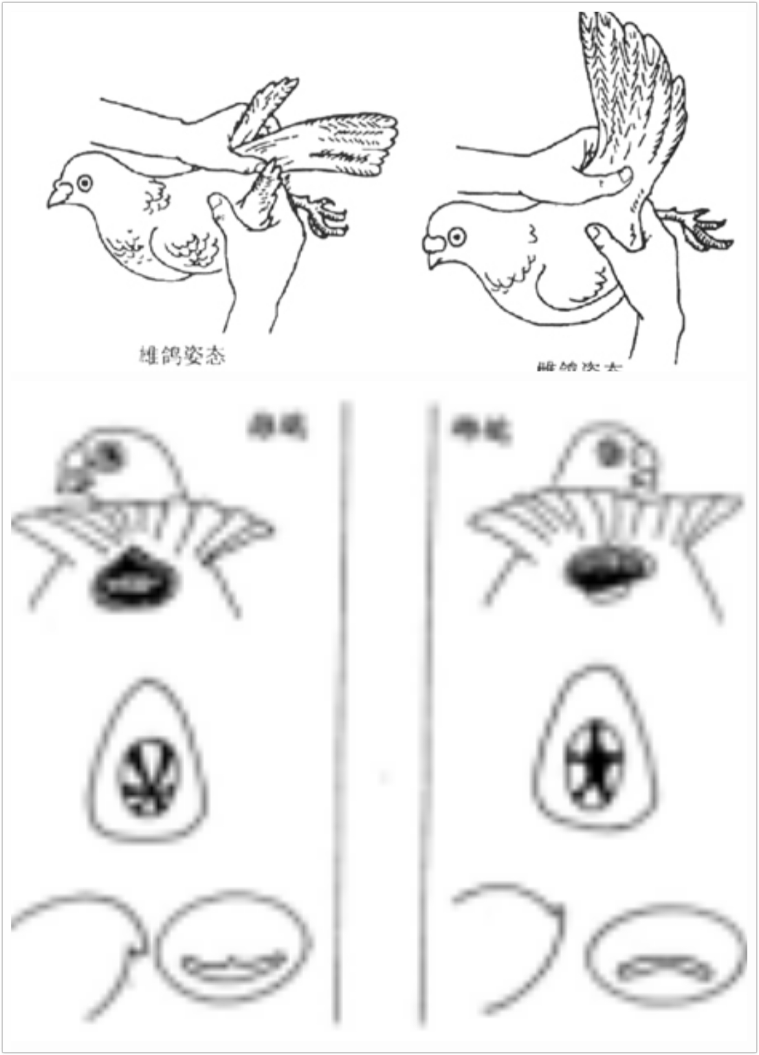 成鸽雄雌的鉴别。从外形看,雄鸽身体较大,颈较粗而硬,脚较粗壮有力,头较大而圆,鼻瘤大而阔,鼻瘤中央没有白色肉线,主羽尖端呈尖状,尾羽常污秽,尾脂腺尖端不开叉,龙骨较长。雌鸽身体较小,体型紧凑,颈部较细而软,脚细而小,头顶平而窄,体态优美,性情温顺,鼻瘤窄而小,四个月以后鼻瘤中央出现白色肉线,主羽尖端呈圆状,尾羽干净,尾脂腺尖端开叉,龙骨较短。手触摸骨盆,雄鸽骨盆窄,两耻骨之间相距约一指宽,雌鸽骨盆宽,两耻骨之间相距约两指宽,且有弹性。在发情时,雄鸽常常追逐雌鸽,围着雌鸽打转“求爱”,频频点头,发出“咕咕”的叫声,颈羽和背羽突起,尾羽散开如扇形,此时雌鸽表现温顺,慢慢走动或低头蹲着,接受雄鸽的“求爱”。
