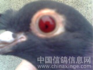 红血蓝的蓝底艳色眼,球也分淡青和深蓝(紫)黑色。如果不是红血蓝眼睛,绝对鸽种不纯的明证。但羽毛色已有纯黑、纯白、纯红、芦花、浅灰、深蓝、灰二线、灰斑(见图) .两点及纯黄尚未见过。