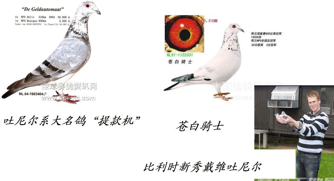 大名鼎鼎的苍白骑士。苍白骑士NL91-1122331白麒麟花黄眼雄鸽,本身获荷兰国家赛14369羽650公里冠军;NPO全国冠军;22次获奖;其中3次冠军作为种鸽,苍白骑士直子、直孙以及直系下代所获冠军超过200次。前10名成绩无法统计,苍白骑士的遗传十分优良,它的羽色呈显性遗传,以麒麟花色为主,眼砂以橙黄眼为显性特征。苍白骑士血系交配詹森系、杨·各多拉斯系、威廉吉尔特系、范内系、西佛托依系、薛仲雅系、乔斯托内系,作出下代都能获奖,苍白骑士血系溶血性非常好,无论是杂交配,还是近亲回血交配都能作出冠军鸽,苍白骑士血系已经发挥至第6代。