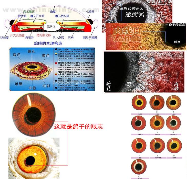水晶体扩张的效应呈现在眼志上,所以往往有许多优秀的赛鴿看上去没有眼志,但随着水晶体的收缩,眼志就变祩冨楚了。所以说眼志的机制行為出现在鴿子眼睛,随着光线总量的变化,水晶体也会有变化,变化小或者不明显的鴿子,就是属于差的。下面介绍10种眼志。