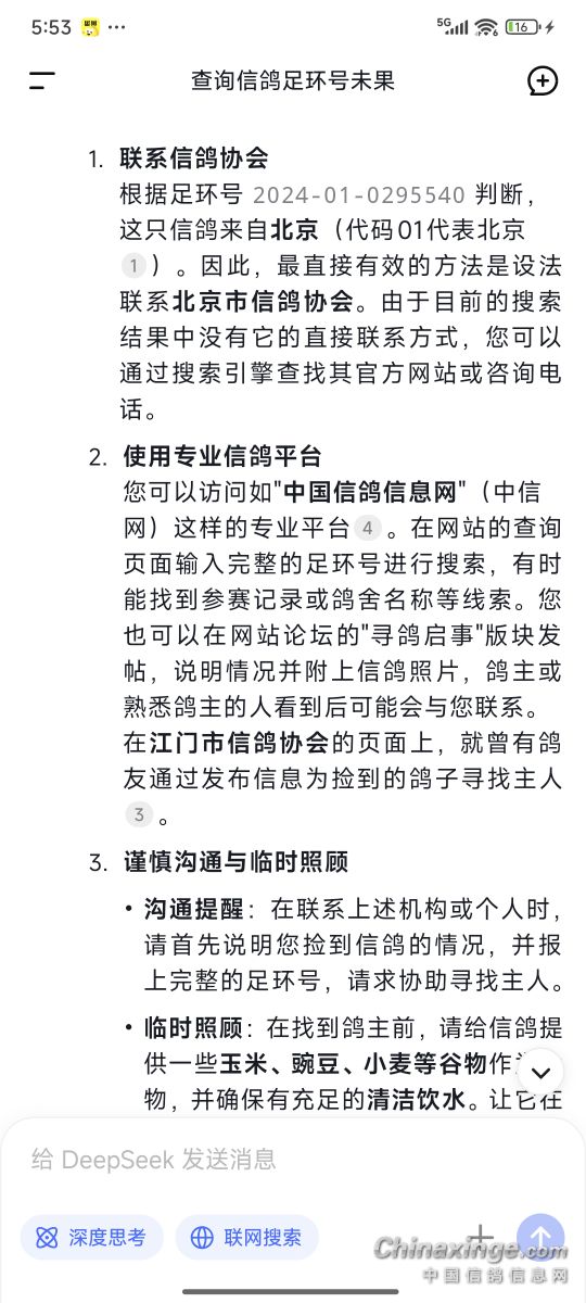 我是河北保定的,从窗户进来一只鸽子,带脚环的,我从不养鸽子,也不知道价值,更不知道怎么处理,有没有主人认领?特意下载来这里问问,好歹生命一条,万一是主人心上之物呢,找不到主人的话,我应该怎么处理?编号是0295540